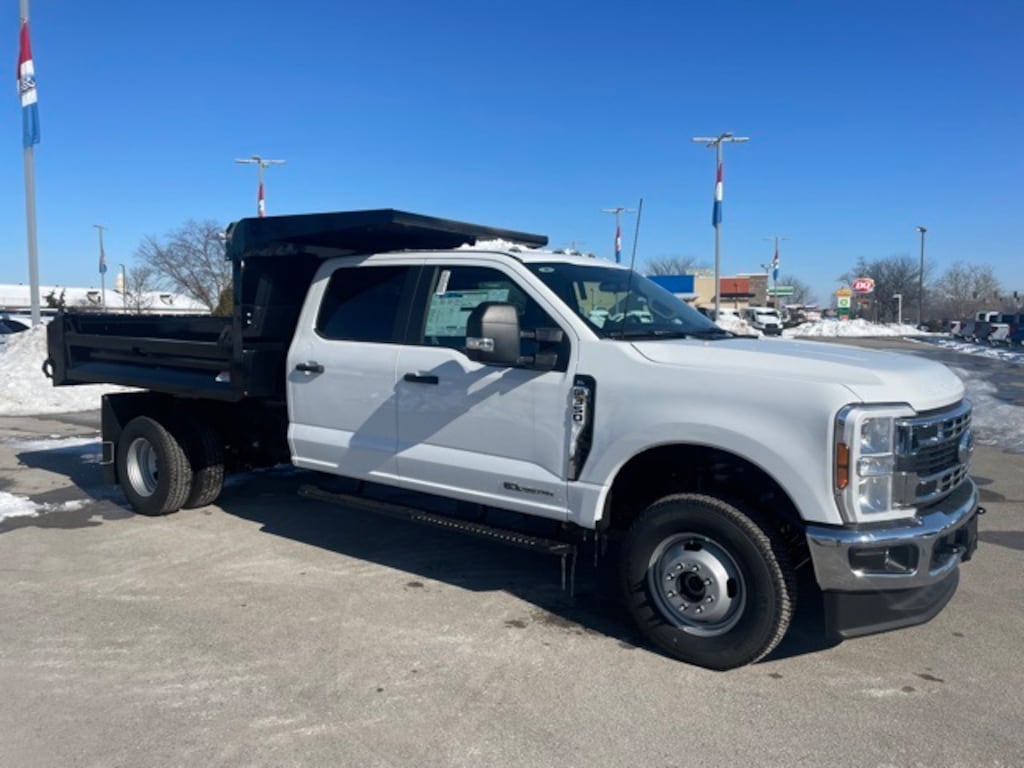 NEW Oxford White 2024 1 ton Ford F-350SD Crew Cab XL Dual Rear Wheel 4x4 Chassis with Knapheide 9ft Steel Dump Body. 6.7L V8 Power Stroke Turbodiesel and 10-Speed Automatic Transmission. Ready for Work Today! **POWERSTROKE DIESEL, **APPLE CARPLAY/ANDROID AUTO, **REAR BACK UP CAMERA, **4WD, **SYNC BLUETOOTH, Bright Grille, Chrome Front Bumper, GVWR: 14,000 lb Payload Package, Halogen Fog Lamps, Limited Slip w/4.10 Axle Ratio, Power Sliding Rear Glass, Rear Window Defroster, Remote Start, XL Chrome Package.